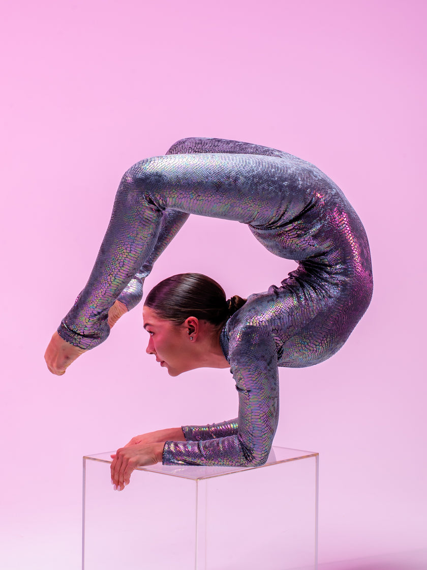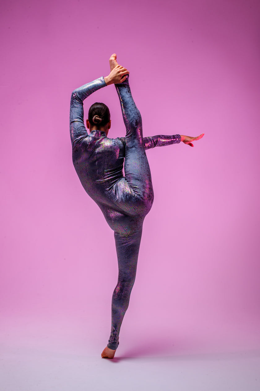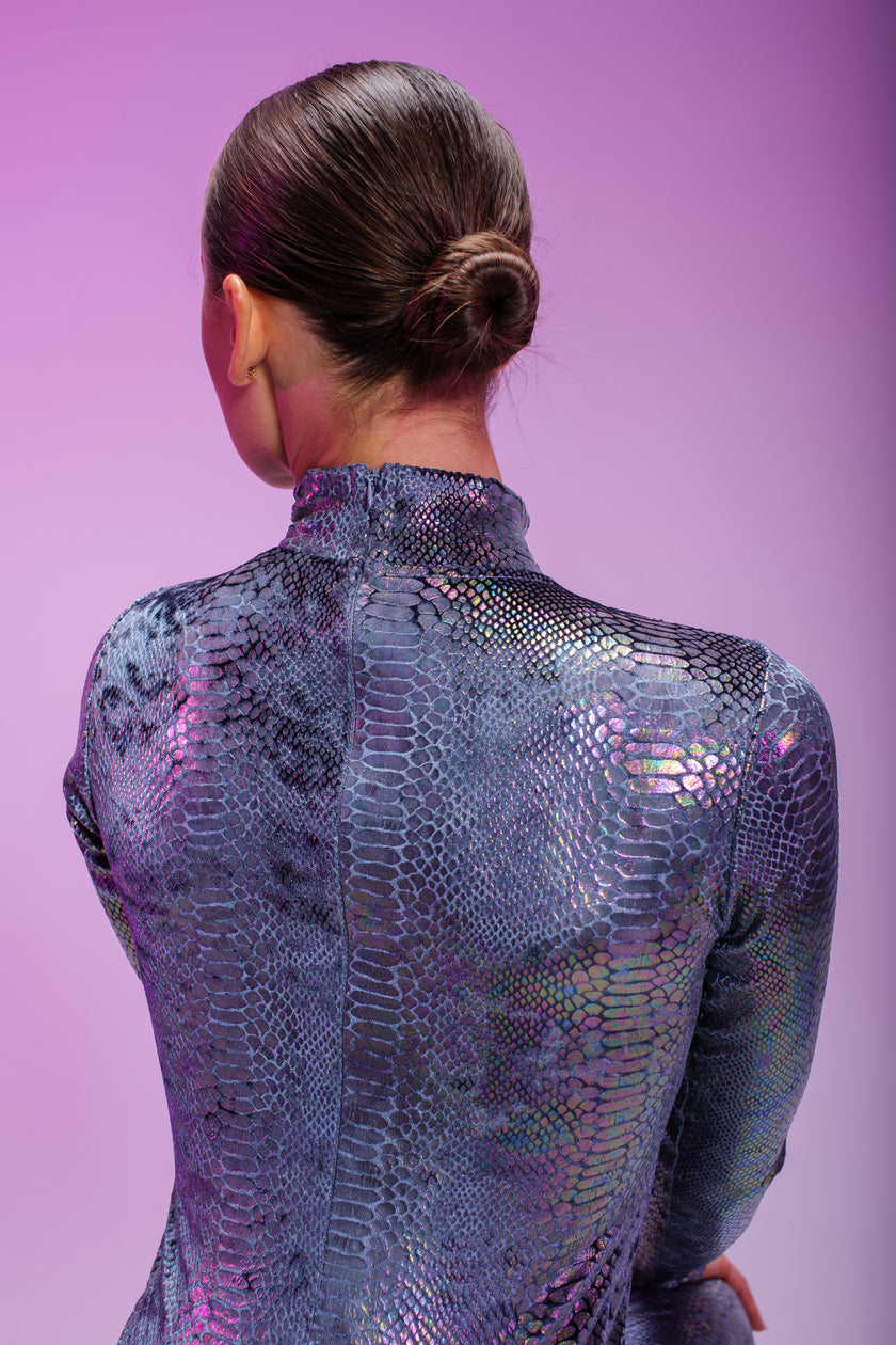 "Snake" unitard is made from strong velvet fabric with multicolor hologram snake pattern